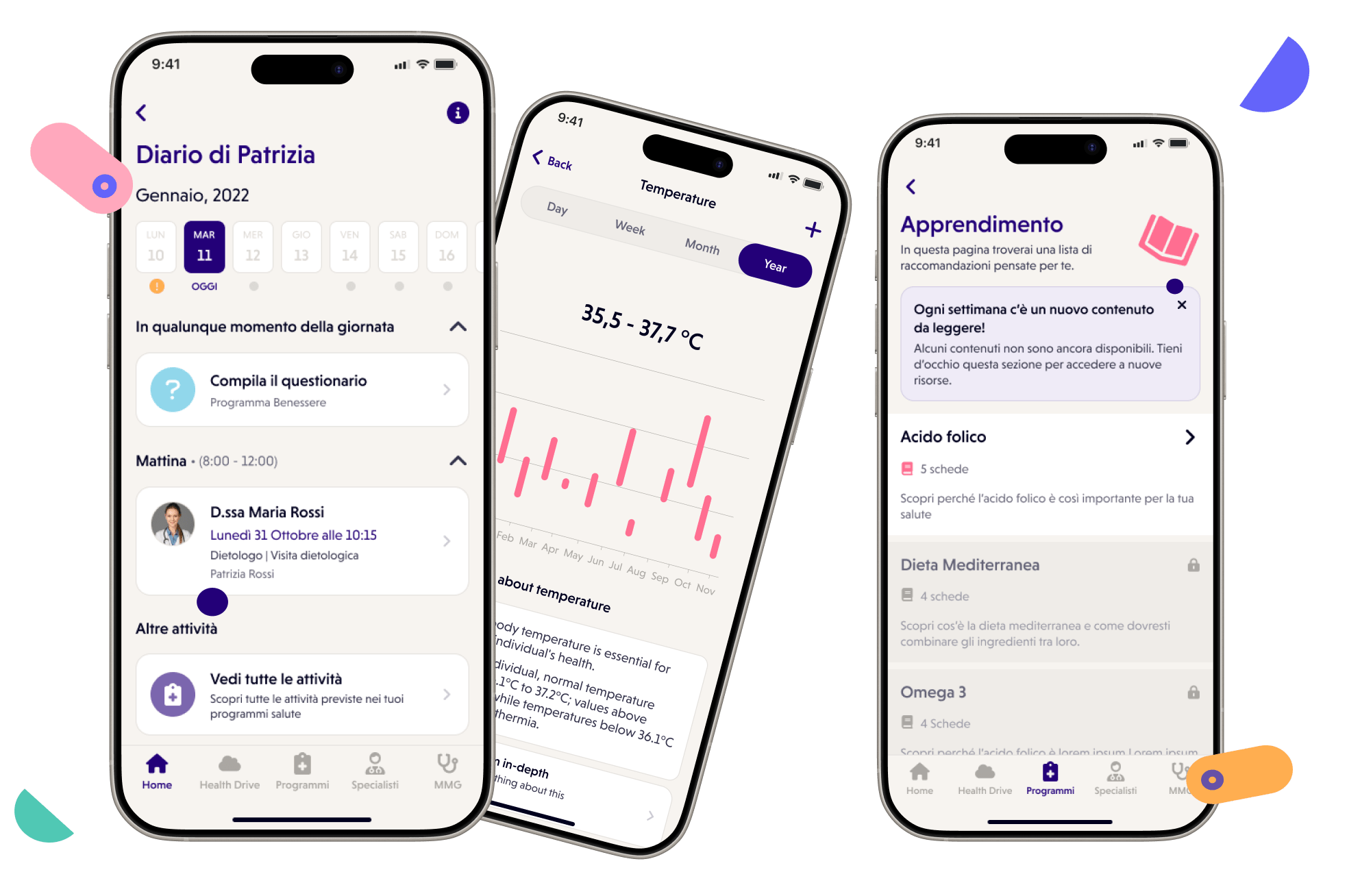 Strumenti per organizzare le attività legate alla salute, registrare sintomi o abitudini e seguire piani di benessere personalizzati.